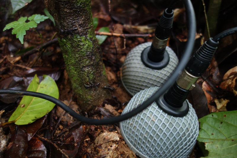 Si je devais (pour partie) préciser ce qui motive mon intérêt à travailler en forêt tropicale humide, je parlerais d'une inversion perceptible des proportions entre les êtres vivants humains et ceux non humains, et du fait indéniable de l'audibilité de cette inversion. Mais au-delà de renverser les proportions du vivant et de révéler une horizontalité des rapports entre les êtres (un humain n'a ici pas plus d'importance qu'une plante où qu'un insecte), ce sont les problèmes cognitifs que posent cette inversion qui m'intéressent. Les surgissements de signaux inhérents à la forêt ne sont régis par rien qui ne puisse être absolument compris ni anticipé par l'homme. Ils sont sujets à interprétation, potentiellement motifs de peur, de stress, de doute. En signant la dynamique de l'autour sans pour autant nous révéler leur sens, ils nous re-situent comme des actants sensibles devant reconsidérer leurs repères et réapprendre à intégrer les perturbations inhérentes au milieu. C'est ici la mise en perspective de plusieurs strates de ces perturbations, et des sentiments qu'elles font émerger, qui m'intéresse : de l'électronique utilisée comme traduction des mes propres émotions et des plaintes émises par mes microphones saturés d'humidité, composés autour de phonographies des stridulations de fourmis Paraponera Clavata (bullet ants), où du bruit de fond d'une portion de forêt du littoral Guyanais (le chemin du Rorota). Les fonctions cognitives humaines, les dysfonctions des microphones, les signaux émis par les fourmis et les existants de la forêt, c'est le calque de ces trois familles de signaux qui active ces pièces. Thomas Tilly, 2018