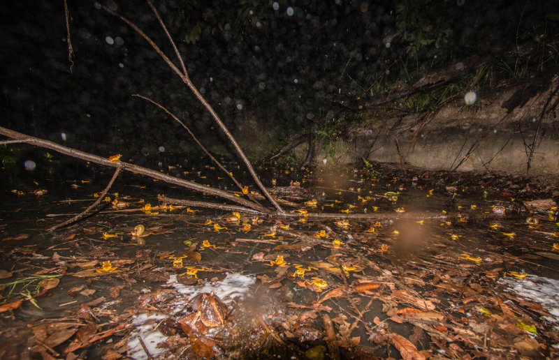 En nous posant la question de la phonotaxie entre espèces dans les reproductions explosives en Amazonie, c’est à dire l’existence où l’absence de relations interspécifiques, dans le son, nous nous engageons forcément à interroger la perception que nous, humains, avons d’un milieu. Le changement abrupt de dynamique induit par le phénomène est aussi le nôtre, et nous nous retrouvons physiquement et mentalement inclus dans un processus qui nous échappe. Nous sommes dérangés, attirés, fascinés, mais n’avons en aucun cas de réelle compréhension ou maîtrise de l’instant, de ses enjeux, des stratégies qu’il déploie. Écouter, observer, enregistrer, filmer, sans pouvoir dépasser le stade de l’interprétation.