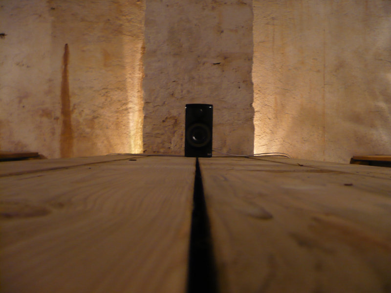 Intégré à la ville et invisible à sa surface, l’abri est constitué de deux salles principales de 80 m2 chacune et de deux couloirs d’accès. Un seul de ces couloirs est aujourd’hui ouvert à l’extérieur et constitue l’unique accès au bâtiment. Ayant eu pour fonction d’héberger les civils lors des attaques aériennes pendant la seconde guerre mondiale, il est uniquement pourvu de bancs et d’un sommaire système de ventilation et d’alimentation électrique. Établi en sous-sol, il ne comporte aucun vis à vis vers l’extérieur et a pour unique fonction de protéger physiquement et phoniquement ses occupants. La situation du visiteur dans cet espace, a ceci de particulier qu’elle ne permet à aucun moment d’avoir une conscience précise de ce qui se passe à l’extérieur. Le lieu est enterré et ne permet pas d’établir un lien avec le dehors. Seul le son, filtré à travers les murs épais, permet de rétablir ce lien.