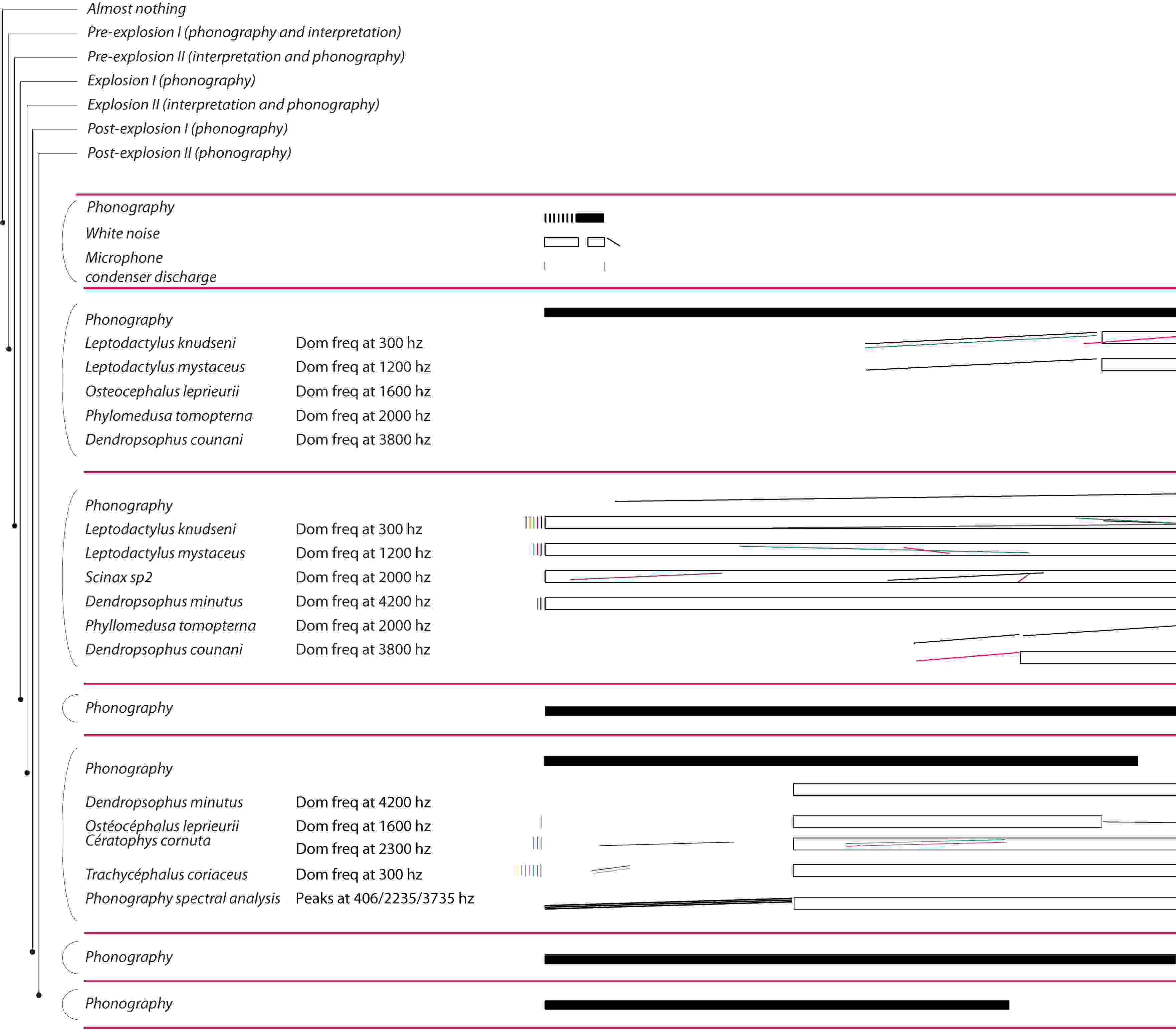 Ces évènements nous troublent cognitivement mais aussi culturellement en ceci qu’ils brisent des images adossées au contexte. Ils ne sont ni l’expression d’un équilibre, ni celle d’une nature supposément hostile. Ils sont au contraire un déséquilibre, une rupture brutale et soudaine de l’ordre des choses n’ayant pour objet que la continuité du vivant. Ils sont au monde animal ce que l’irrationalité d’un concert de musique bruitiste où un débordement de foule portent de sens au monde humain. Il ne s’agit plus ici de partage mais d’une saturation de l’espace, exagération des spectres de la lumière et du son. Ce dépassement de dynamique n’a probablement de sens que dans sa très courte temporalité ; une extrême brièveté transformant les espaces localisés que sont les mares en des aires au fonctionnement autonome, se singularisant du réseau de la forêt pour ensuite mieux le réintégrer en le nourrissant de nouveaux existants. Les reproductions débutent leur phase de pré-éxplosion dans une certaine hétérogénéité d’avec le lieu, pour ensuite affirmer ce dépassement dans les phases d’explosion et de post-explosion, et enfin se réaccorder à l’autour. Les animaux se dispersent alors et les cent décibels acoustiques de l’explosion laissent de nouveau place à une forêt dont le spectre audible semble être précisément partagé.