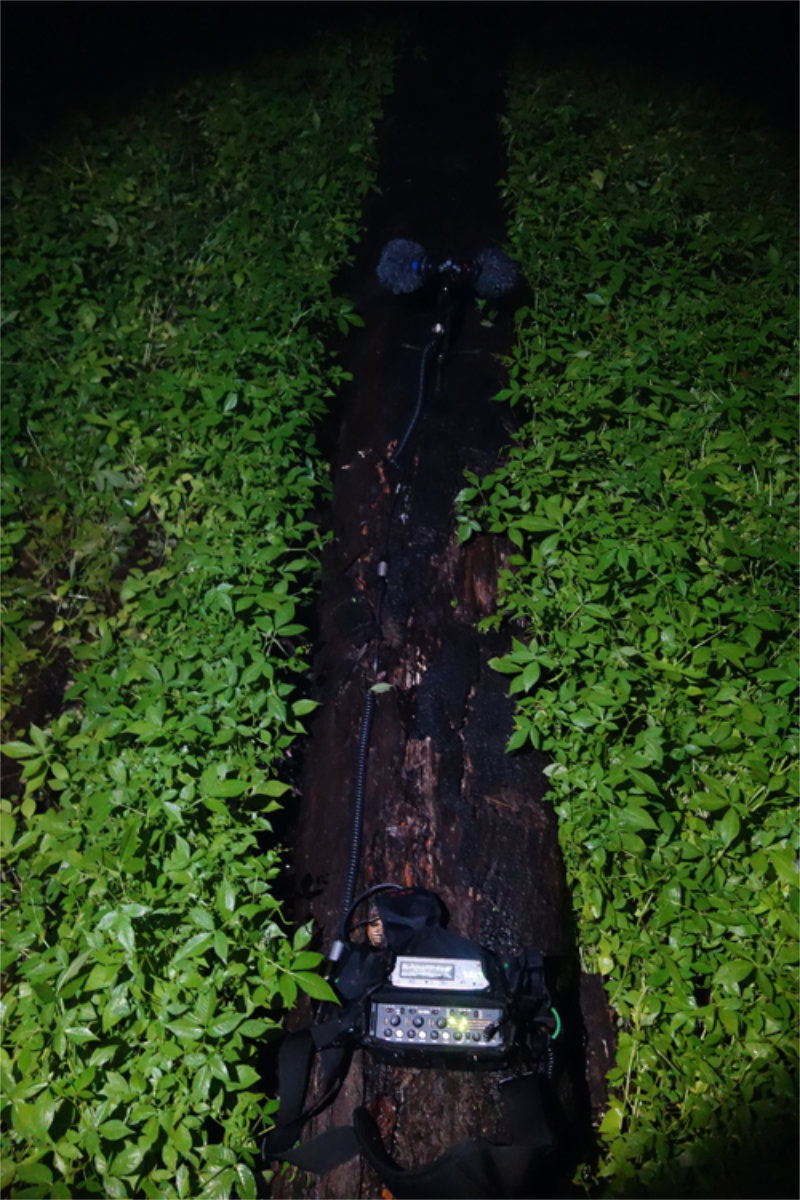 En nous posant la question de la phonotaxie entre espèces dans les reproductions explosives en Amazonie, c’est à dire l’existence où l’absence de relations interspécifiques, dans le son, nous nous engageons forcément à interroger la perception que nous, humains, avons d’un milieu. Le changement abrupt de dynamique induit par le phénomène est aussi le nôtre, et nous nous retrouvons physiquement et mentalement inclus dans un processus qui nous échappe. Nous sommes dérangés, attirés, fascinés, mais n’avons en aucun cas de réelle compréhension ou maîtrise de l’instant, de ses enjeux, des stratégies qu’il déploie. Écouter, observer, enregistrer, filmer, sans pouvoir dépasser le stade de l’interprétation.