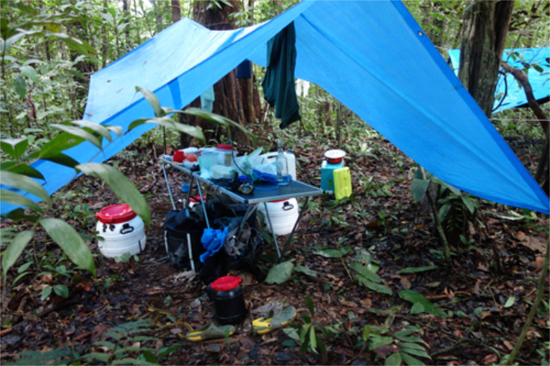 Alors que le premier volet de ce travail : Codex amphibia (an interpretation of the explosive breeding phenomenon) – Glistening examples 2018) – pointait la question de l’interprétation des langages non humains, Codex amphibia (phonotaxis) aborde lui le pic de l’explosion comme point de référence d’un milieu. Les enregistrements et compositions issus de ce travail de terrain explorent le cœur du phénomène et sa porosité avec l’autour ; un autour fait d’autres dynamiques, d’autres timbres, d’origines humaines et non humaines. Ces pièces ont étés réalisées au fil de nos observations de terrain et en parallèle d’un travail de recherche mené par Antoine Fouquet et moi même avec l’aide d’une équipe de bénévoles, puis détaillé par Antoine et plusieurs collaborateurs dans l’article « HETEROSPECIFIC CHORUS ATTRACTION IN TROPICAL FROGS ». Par le frottement de nos deux approches scientifique et artistique ; approche hybride ne faisant que nous pousser plus avant dans nos questionnements et paradoxes, nous nous accordons (peut-être) les possibles d’un autre rapport à cette forêt.