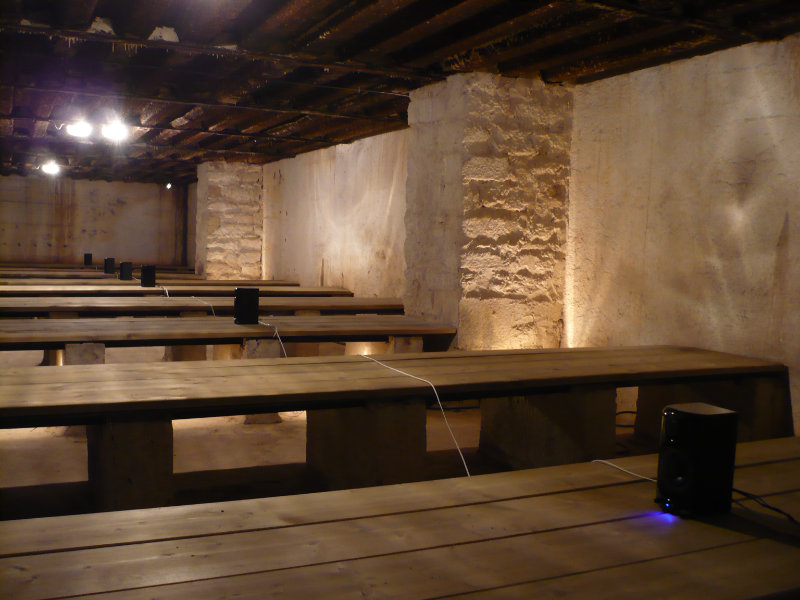 Intégré à la ville et invisible à sa surface, l’abri est constitué de deux salles principales de 80 m2 chacune et de deux couloirs d’accès. Un seul de ces couloirs est aujourd’hui ouvert à l’extérieur et constitue l’unique accès au bâtiment. Ayant eu pour fonction d’héberger les civils lors des attaques aériennes pendant la seconde guerre mondiale, il est uniquement pourvu de bancs et d’un sommaire système de ventilation et d’alimentation électrique. Établi en sous-sol, il ne comporte aucun vis à vis vers l’extérieur et a pour unique fonction de protéger physiquement et phoniquement ses occupants. La situation du visiteur dans cet espace, a ceci de particulier qu’elle ne permet à aucun moment d’avoir une conscience précise de ce qui se passe à l’extérieur. Le lieu est enterré et ne permet pas d’établir un lien avec le dehors. Seul le son, filtré à travers les murs épais, permet de rétablir ce lien.
