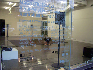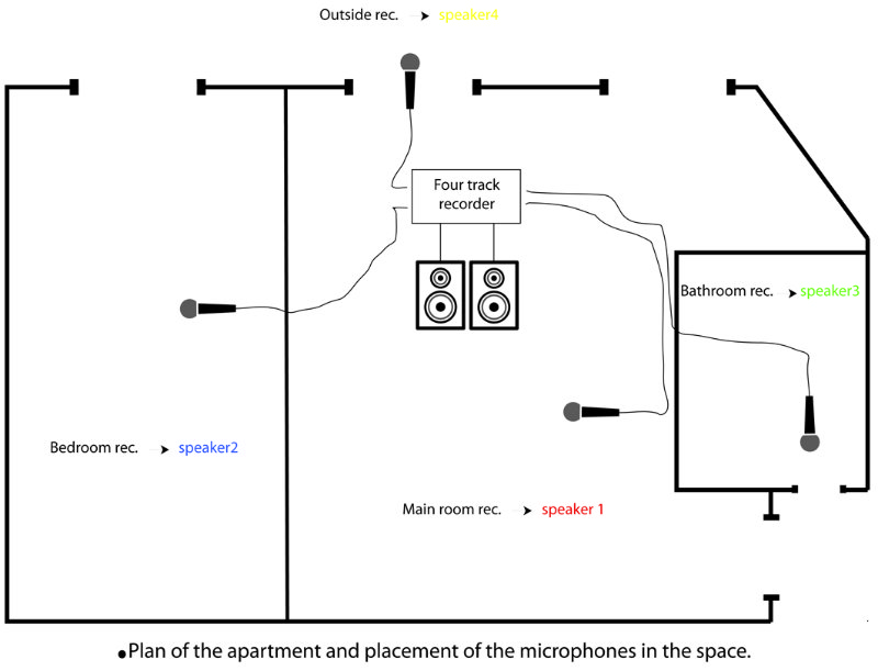 «Room field» est une pièce pour quatre hauts parleurs mettant en relation différents plans sonores captés au sein de mon lieu de vie (un appartement parisien). Cette spatialisation se construit sur la base d’un découpage géographique virtuel du lieu, opéré par le placement de microphones dans l’espace. La matière/base de cette pièce est de ce fait constituée d’enregistrements en quatre points. Chaque point de captation du lieu correspond à une «zone» de l’appartement (pièce principale, chambre, salle de bain, cour) et est attribué à un haut-parleur dans le dispositif. Ces captations sont réalisées de jour comme de nuit. D’une autre part, des prises de sons mono et stéréo réalisées en divers points du lieu sont intégrées au dispositif. Appuyant ces changements de dynamique de l’espace. Room field est une réorganisation de mon environnement sonore quotidien, une transposition de l’espace privé de l’appartement dans l’espace public de la galerie d’exposition.